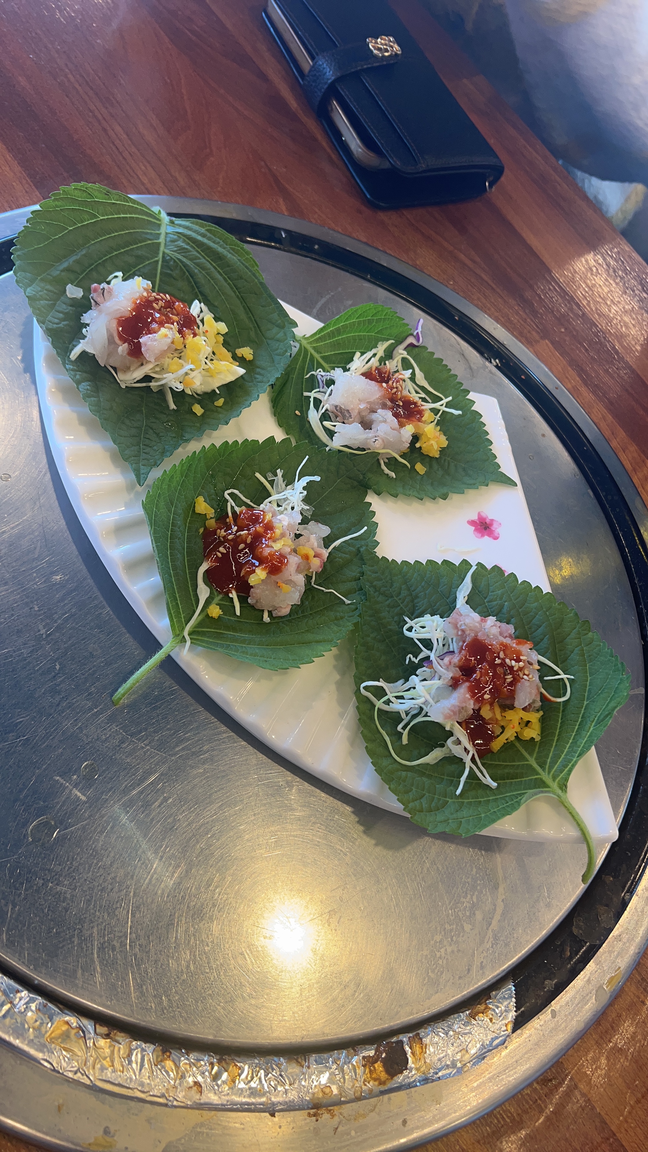 세꼬시 단무지 야채 등에 사장님의 비법 소스를 뿌린걸 깻잎에 싸 먹는건데